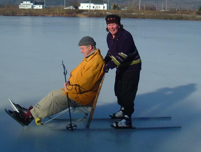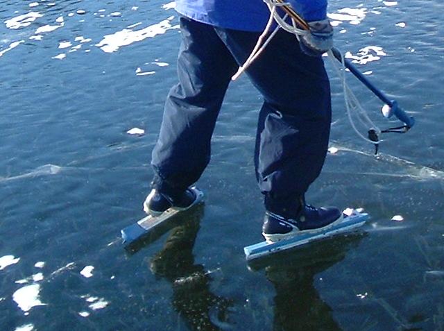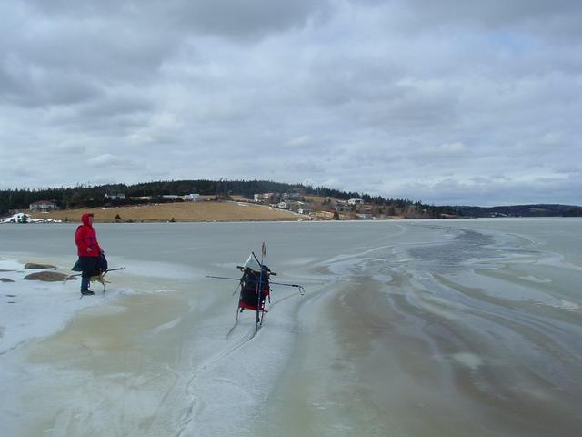 Porters Lake (44-39'N 63-19'W) is connected to the ocean by a narrow channel at Lawrencetown Beach and thus is slightly salty and has a small tide. It is probably the only place in the world where you see people ice skating, ice sailing or kicksledding on one side of the highway and people surf boarding on the other! There was an open "roak" across the southern cove, which we crossed at the far shore. There were also strips of open water in the narrow, shallow sounds between islands.
