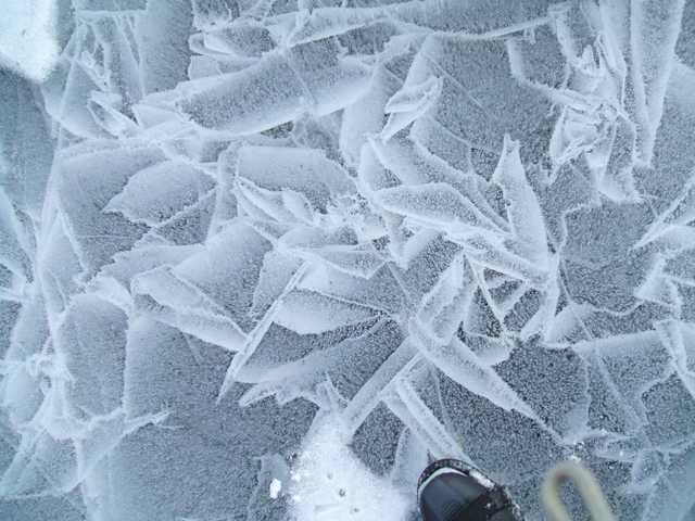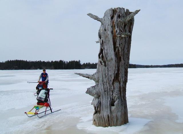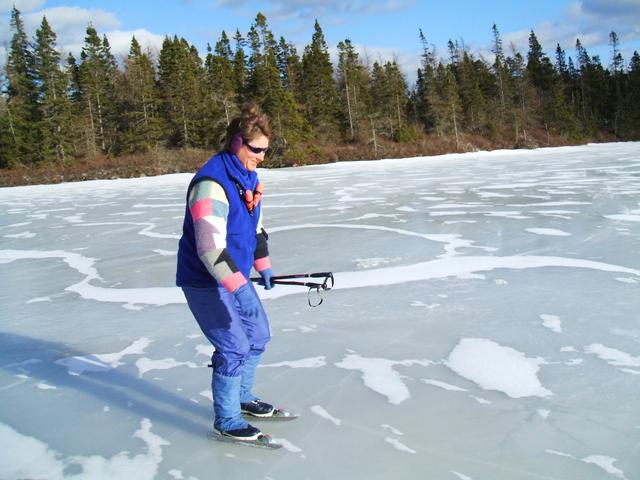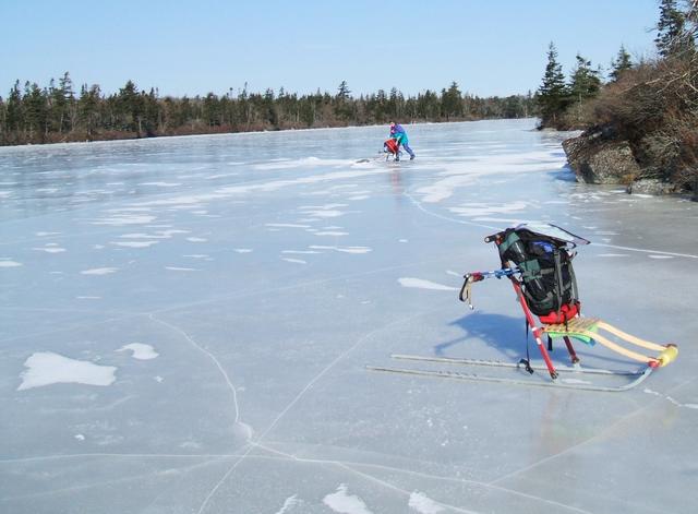 Hubley Big Lake, about 20 km west of the city, had about 3 cm of snow. In lee areas (along west side of the lake), the snow was loose and offered little resistance to either skates or kicksleds. In the middle of the lake, the ice had strips of bare ice alternating with strips of high-friction wind blown snow. Now I know what Swedish skaters mean by the expression "braking-snow"!