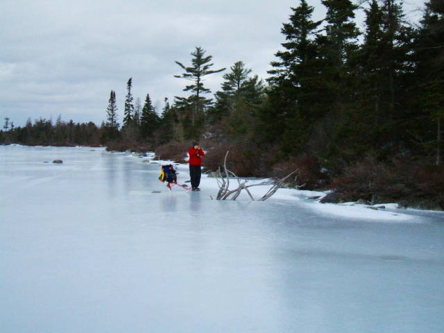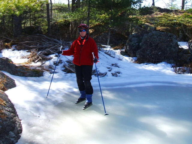 Extremely variable weather in late Novemeber and early December. This week the temperature varied from -10 to +20 with heavy rain, heavy snow, high winds. Dec 7- Dec 8 we got about 20 km of snow followed by a day of -10 C. I skied to the small pond, called Little Lake and found that the snow cover had almost completely slushed down and refrozen. I skated about 10 laps of the pond, probably 4 km.
